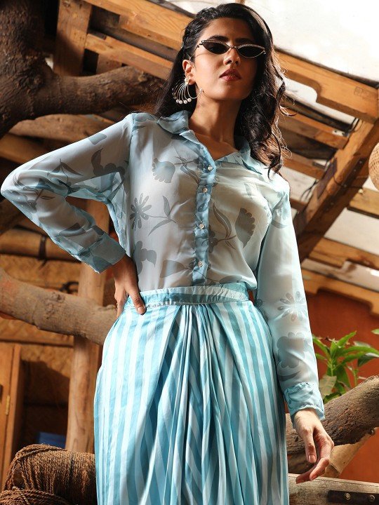 Blue Printed Shirt Collar, Long Sleeves, full placket button closure and regular waist hem