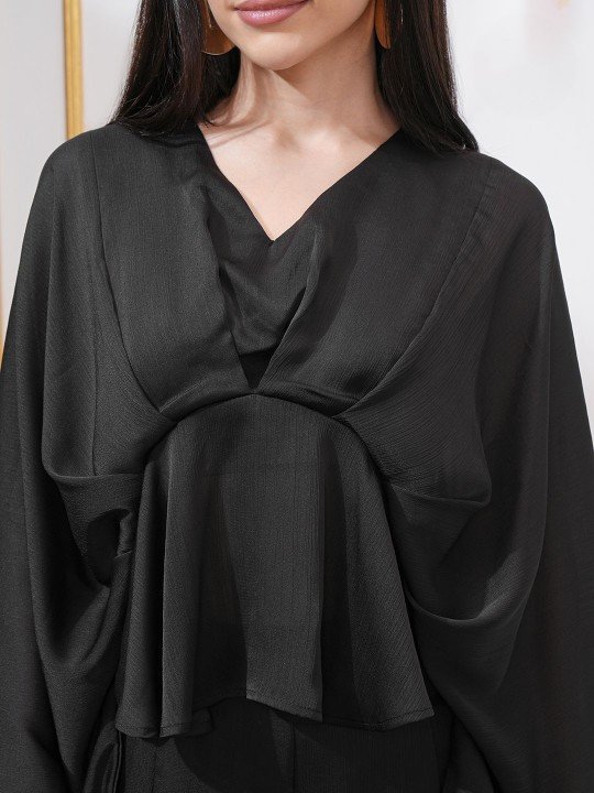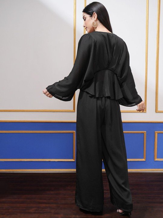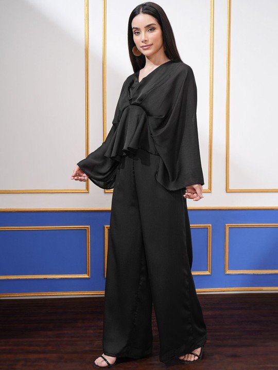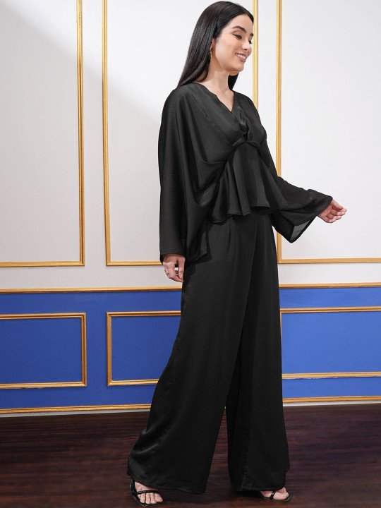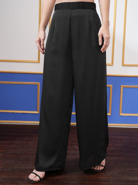 Black solid palazzo, has an elasticated waistband with slip-on closure