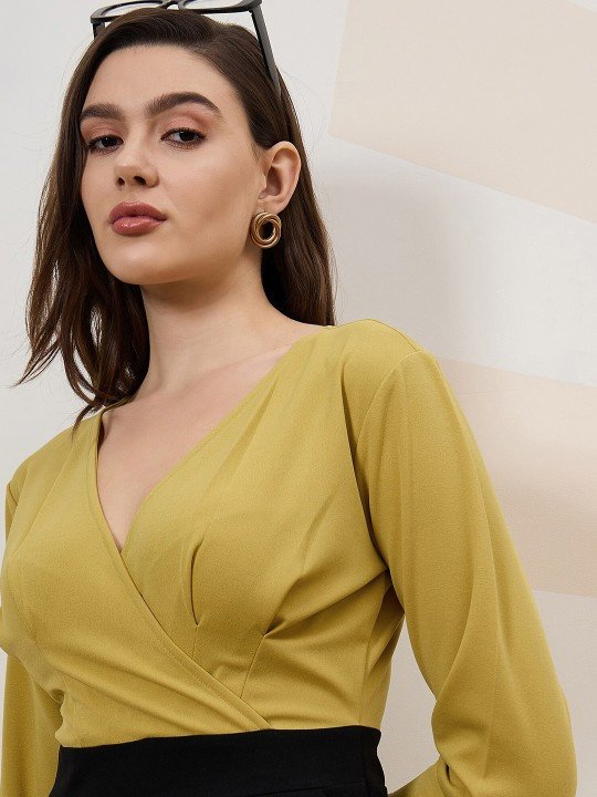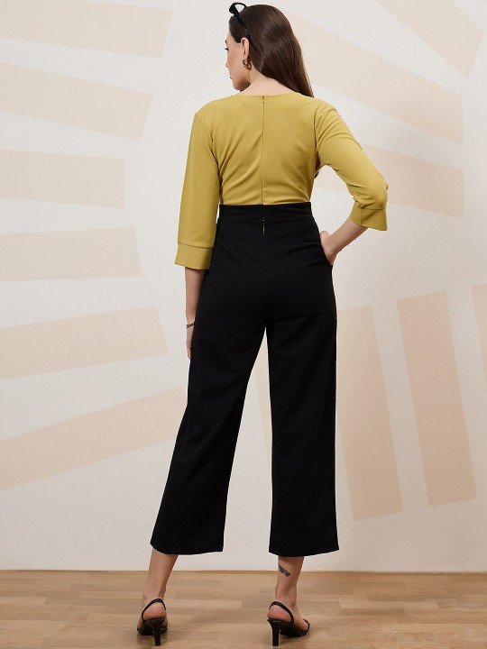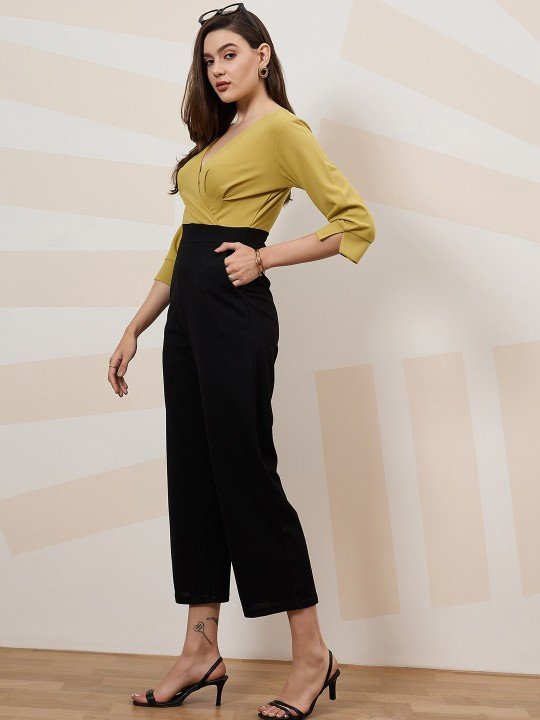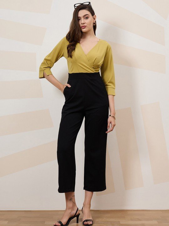 Yellow and black colourblocked basic jumpsuit ,has a v-neck, three-quarter sleeves, 2 pockets