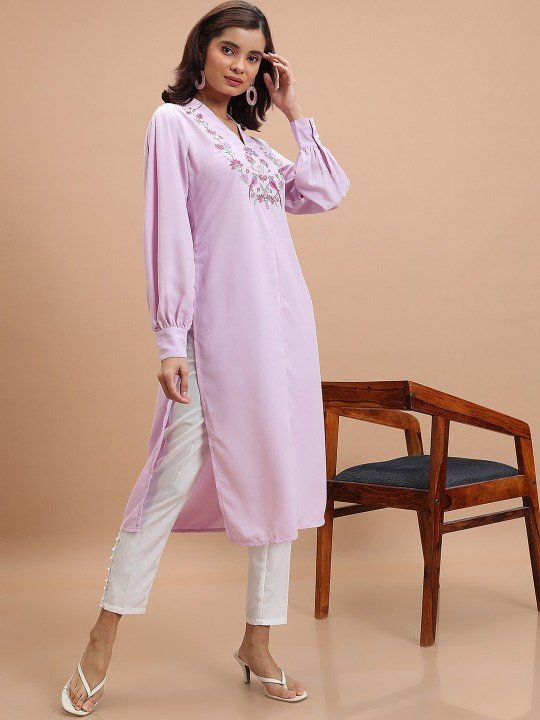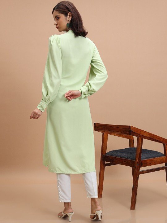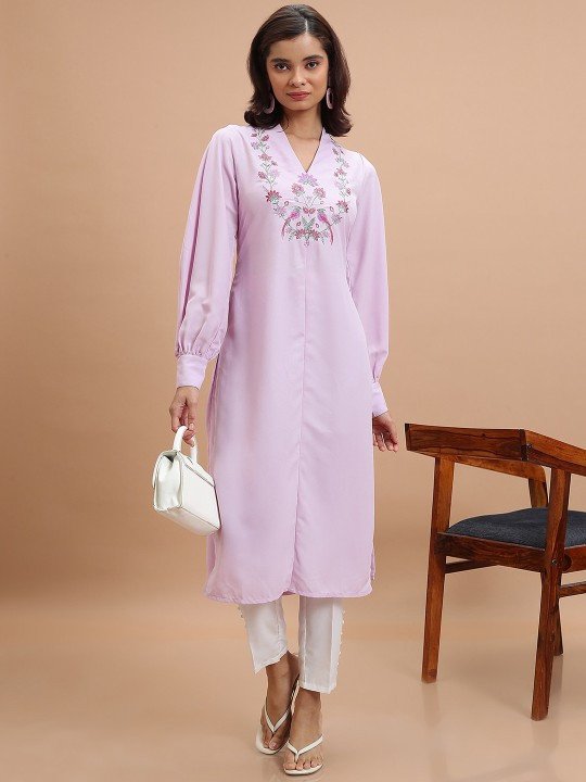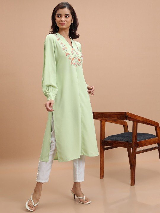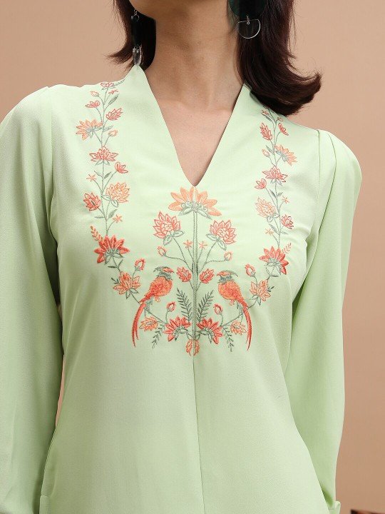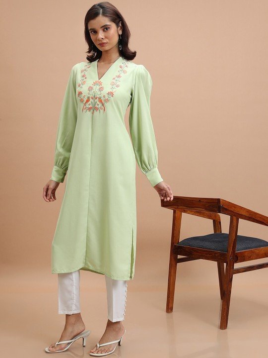 Green Floral Yoke Design Thread Work Straight Kurta