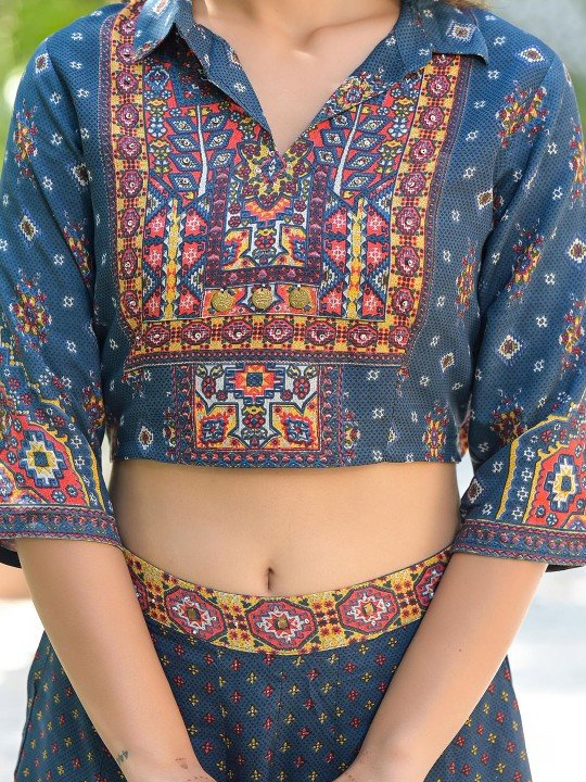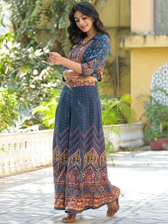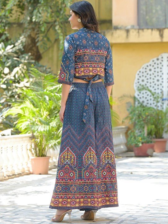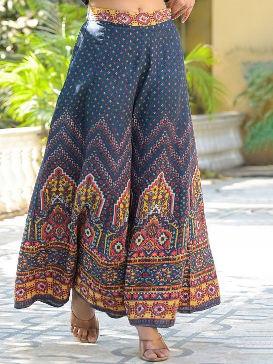Navy blue printed mid-rise palazzo, slip-on closure and 1 Pocket and flared hem