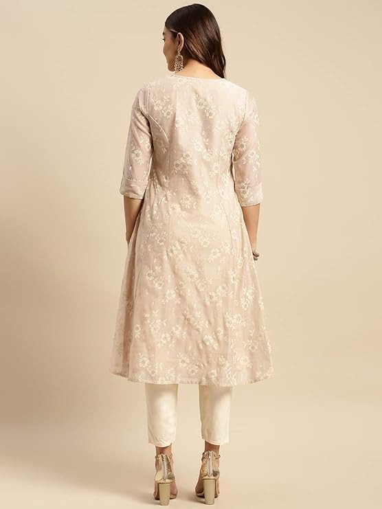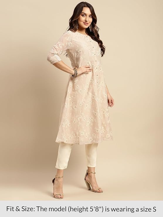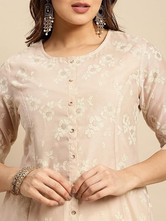 rangita Beige Chanderi Calf Length Printed Flared Kurti for Women | Kurta for Women
