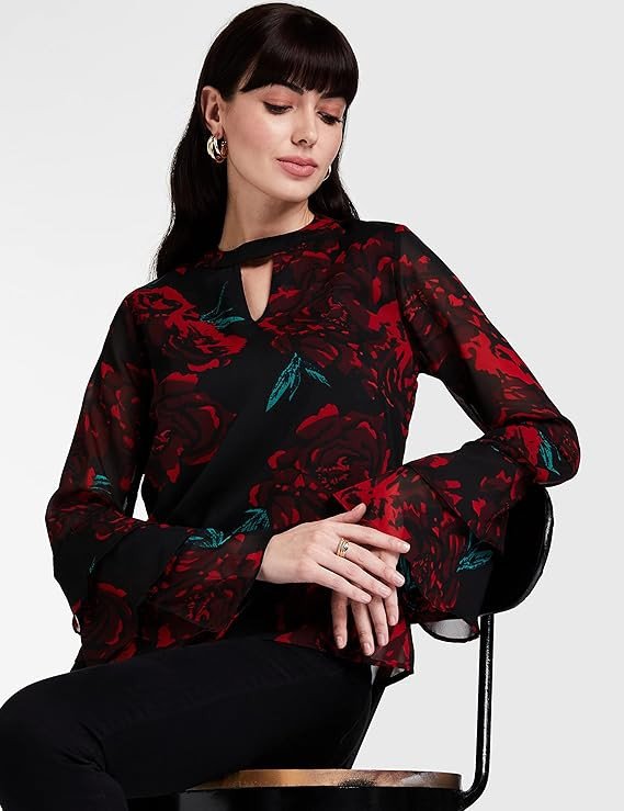 Black printed woven regular top, has a keyhole neck, long sleeves.