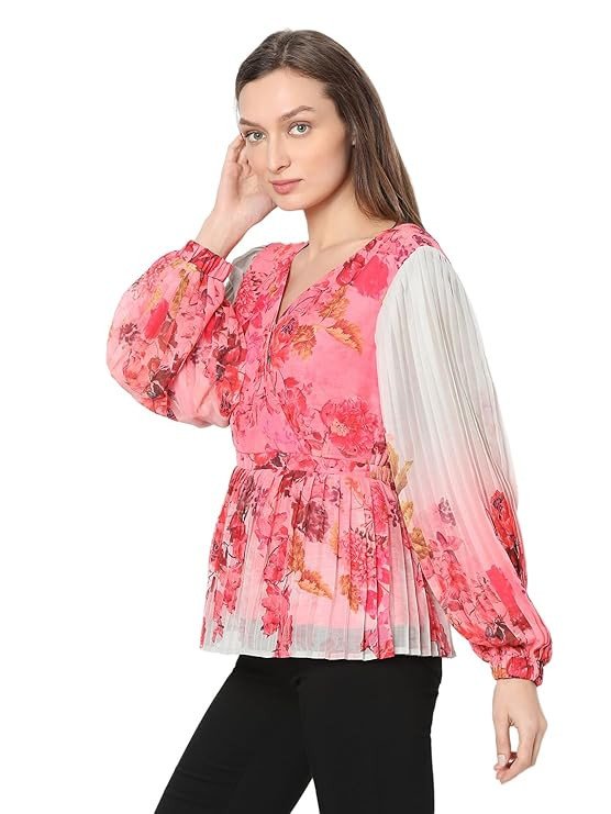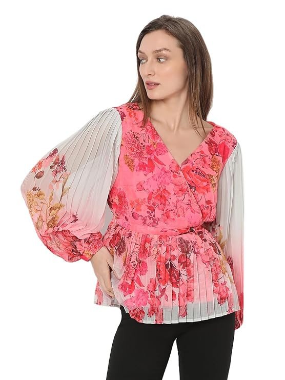 Our exquisite Floral Ombre Top is a testament to elegance and sophistication. Embrace timeless femininity with its delicate pink hue and intricate floral print, seamlessly transitioning from light to dark shades. The overlapping V-neckline exudes grace, while the fit and flared silhouette effortlessly flatters every figure. Luxurious volume long sleeves adorned with heat-set pleats and elasticated cuffs add a touch of refinement. The heat-set pleats along the flared part of the top create graceful movement with every step. Accentuating the waistline is a self-fabric band, ensuring a tailored fit. Designed to perfection, the top hem falls slightly below the hips, elongating the silhouette. Style note: Pair with tailored trousers or a sleek skirt for a polished ensemble that effortlessly transitions from day to night