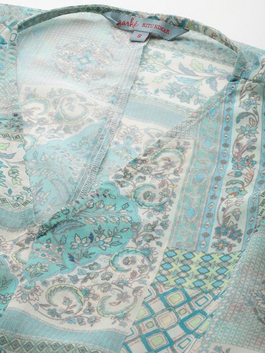 Blue printed crop top, has a v-neck, long sleeves